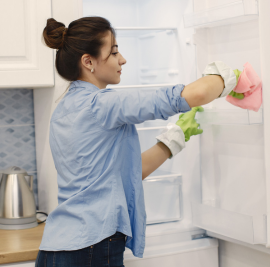 During fridge cleaning, all items are removed before scrubbing every interior surface. The fridge is fully disinfected, cleaned edge to edge, and items are carefully placed back once sanitation is complete.