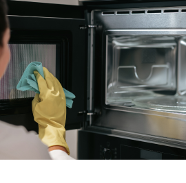 We remove the spinning plate and wash it with soap and water. The interior walls, door, and surfaces are then thoroughly cleaned and disinfected to remove stains, odors, and food residue.