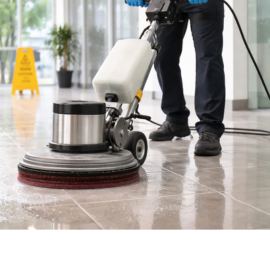 We use a commercial-grade power floor stripper to remove old buildup, stains, and residue. Floors are then polished to restore shine, durability, and a clean, professional finish across all floor types.